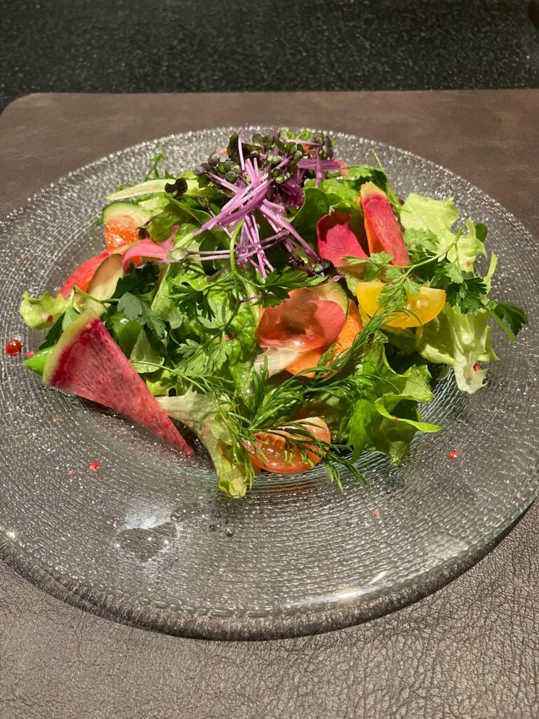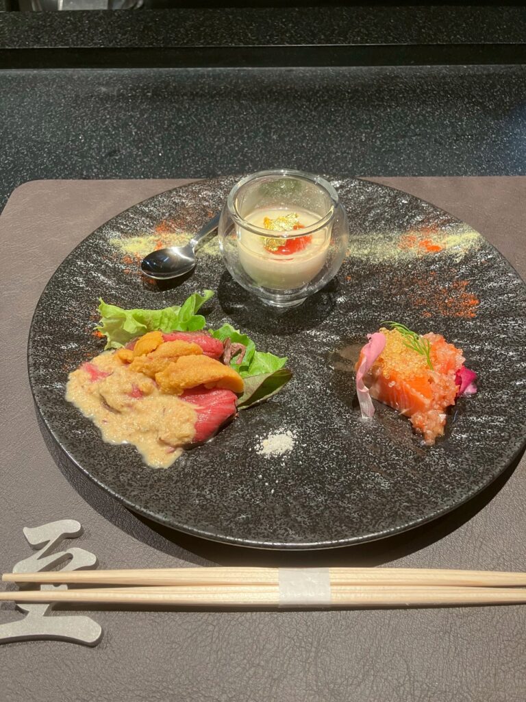 美しく盛り付けられた前菜から始まり、季節の旬食材を使った一皿一皿を、鉄板の上で丁寧に仕上げます。
